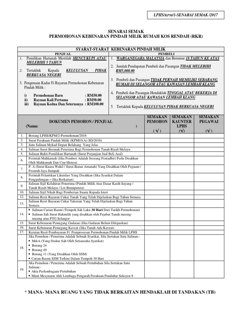 Suratan HakmilikCatatan Carian Rasmi atas nama PenjualSurat Kebenaran Pindahmilik dari Pejabat Tanah jika ada sekatan pindahmilik daripada pihak berkuasa ATAU Suratan Hakmilik atas nama ahli ATAU Borang Pindahmilik KTN 14A atas nama pemilik. Antara borang yang perlu diisi adalah seperti berikut. Pemohon atau pasangan tidak pernah memiliki rumah sama ada melalui projek kerajaan atau swasta di Selangor.